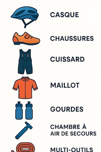 - Cuissard (40-80€), maillot (30-60€), veste légère (50-100€), chaussures (70-150€)